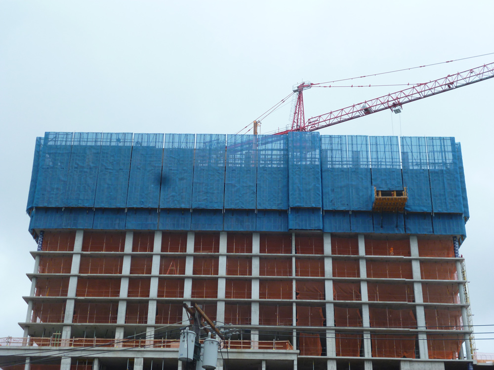 Pour garantir un espace de travail sûr, nous avons couvert l’extérieur de l’édifice avec la protection auto-grimpante HWS. Ces panneaux entourent l’étage en cours de construction ainsi que les trois étages inférieurs, et se hissent de façon hydraulique au fur et à mesure de l’érection du bâtiment.