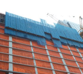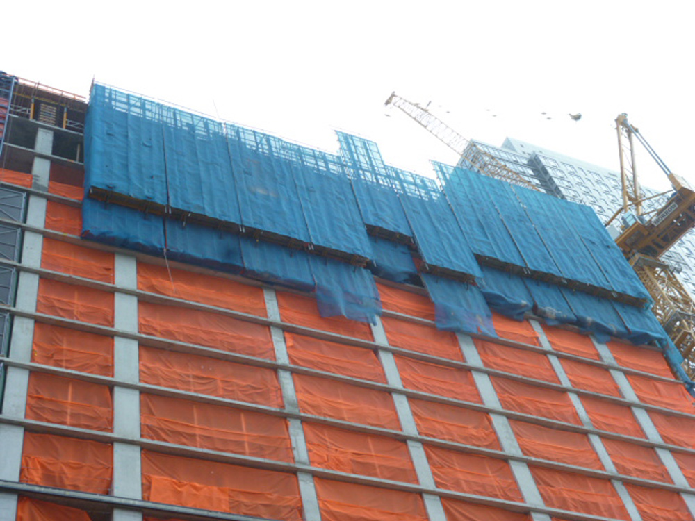 De 13 m de haut sur 3,6 m de large, ces panneaux présentent différentes configurations : configuration droite ou avec plateforme de travail pour la manipulation de matériel. Nous les avons couverts avec un filet à mailles renforcées pour trois raisons principales : premièrement pour éviter toute chute éventuelle de personnes ou d’objets de toutes tailles, deuxièmement pour protéger les dalles en constructions du vent et des intempéries, et troisièmement pour permettre l’entrée de lumière naturelle.