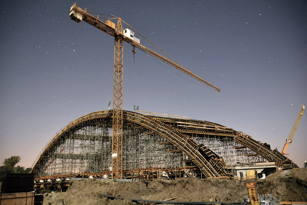 Les arcs et poutres transversales qui les relient se composent également de coffrage ENKOFORM VMK puisque ce système offre une grande résistance et une grande adaptabilité. Pour donner leur courbe aux panneaux phénoliques du tablier, nous avons utilisé une charpente de soutien incurvée. La courbe des extrémités de l’arc, plus prononcée, a été obtenue à l’aide de tendeurs E placés sur des entretoises et connecteurs MK. La courbe de la partie centrale de l’arc, moins marquée, a été obtenue par une simple adaptation des vérins à vis du système d’étaiement.