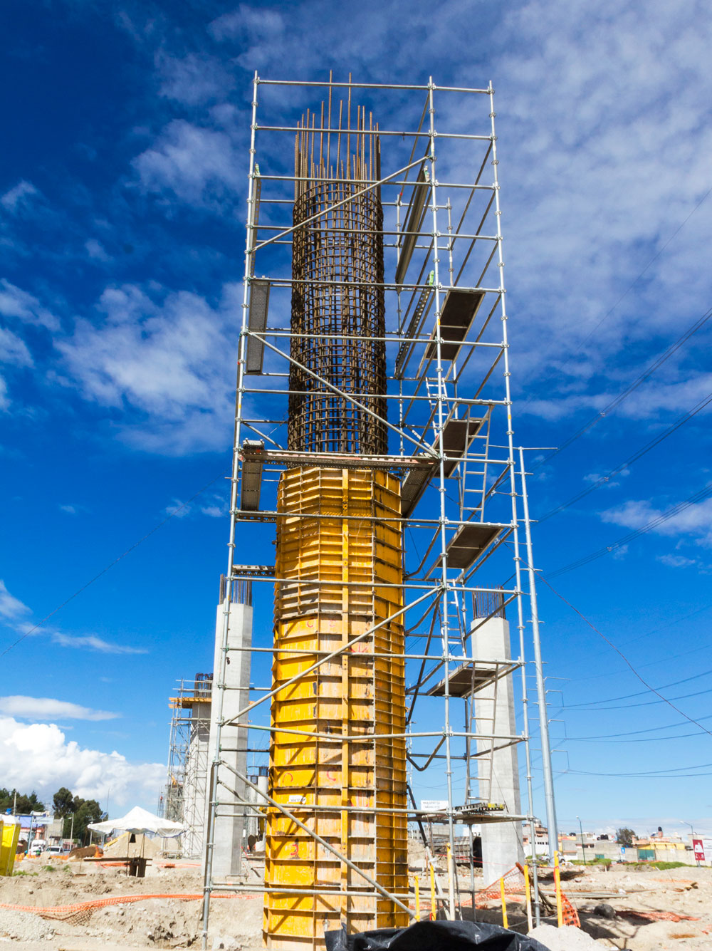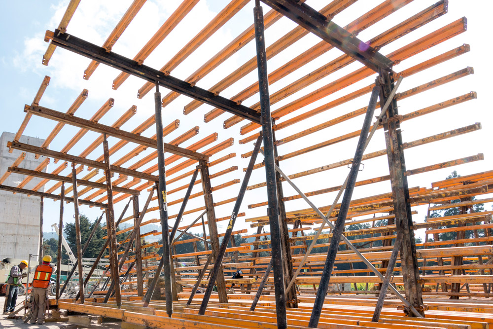 Nous avons adapté la hauteur de l’étaiement tout au long du tronçon. Ce système d’étaiement complet soutenait un coffrage ENKOFORM et un coffrage spécialement conçu pour les piliers, composé de quatre panneaux métalliques (deux frontaux et deux latéraux).