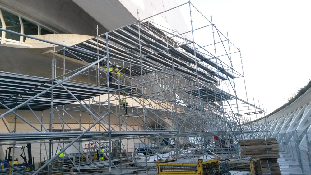 Les échafaudages ont été stabilisés par des ancrages placés dans la structure métallique du bâtiment, et certaines tours d’échafaudages ont été élargies jusqu’à atteindre 12 m, afin de garantir l’équilibre de la structure. Finalement, un monte-charge a également été adossé à l’échafaudage afin de faciliter le transport des matériaux de construction du nouveau revêtement.