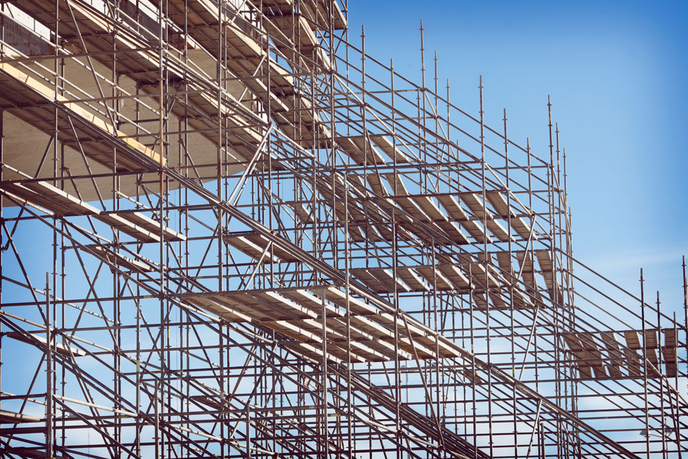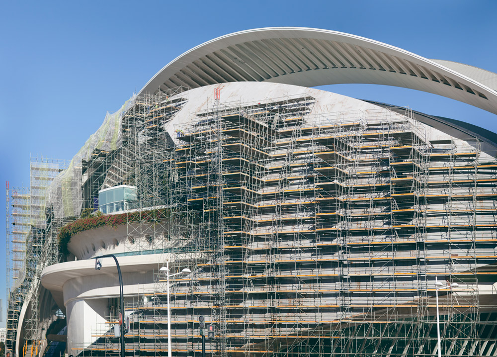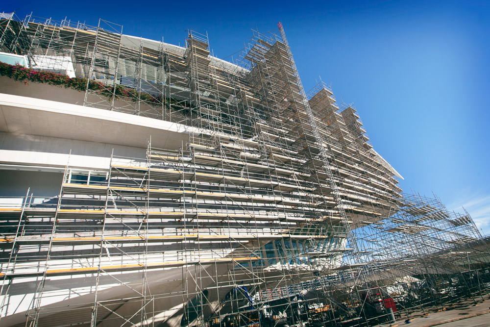 Afin d’embrasser la forme courbe de l’édifice, des échafaudages équivalents à 48 000 m³ de volume et 12 000 m² de superficie ont été placés sous forme de saillies consécutives. Des plates-formes de travail de 700, 1 020, 1 500 et 2 000 mm de large ont assuré en permanence la sécurité des travailleurs et un écart optimal entre l’échafaudage et la façade. L’accès aux différents lieux de travail se faisait par les escaliers incorporés dans l’échafaudage.