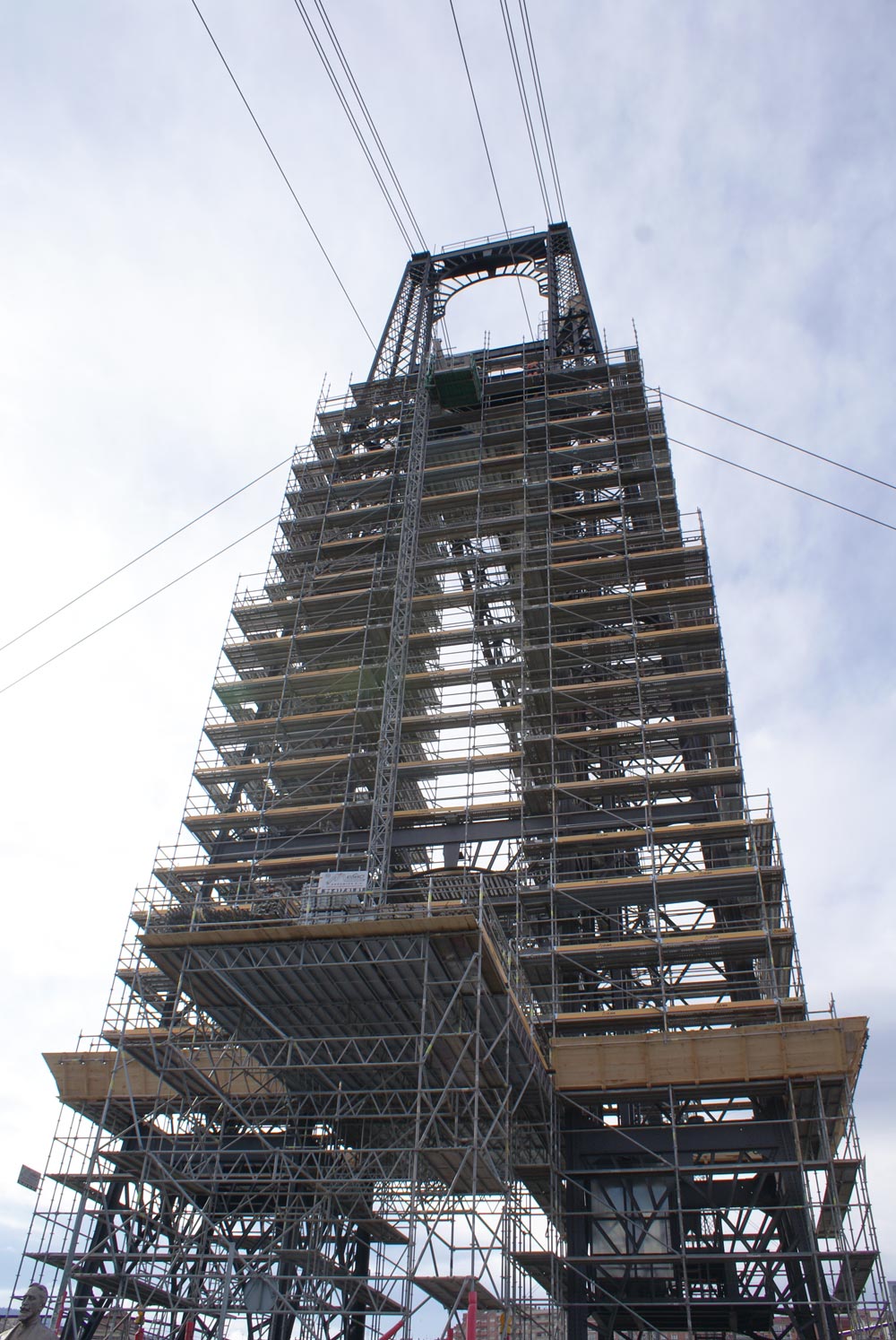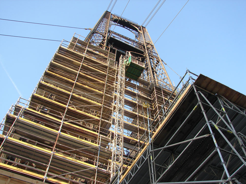 Les échafaudages des tours du pont ont été utilisés pour positionner le plancher d’appui du monte-charge. Ce dernier, muni de plateformes d’échafaudage appuyées sur des passagescamions de 5 m de longueur se situait à 7,5 m de hauteur.