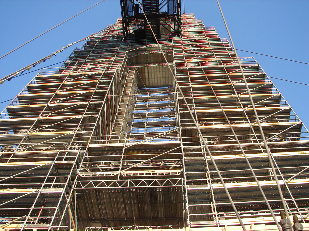 La structure a été totalement recouverte avec l’échafaudage multidirectionnel BRIO. 800 tonnes de matériel ont été réparties sur 4 tours mesurant 68 m et sur le tablier horizontal de 162 m de longueur. Les échafaudages des tours étaient ancrés au sol, tandis que ceux des tabliers étaient suspendus à une ferme.