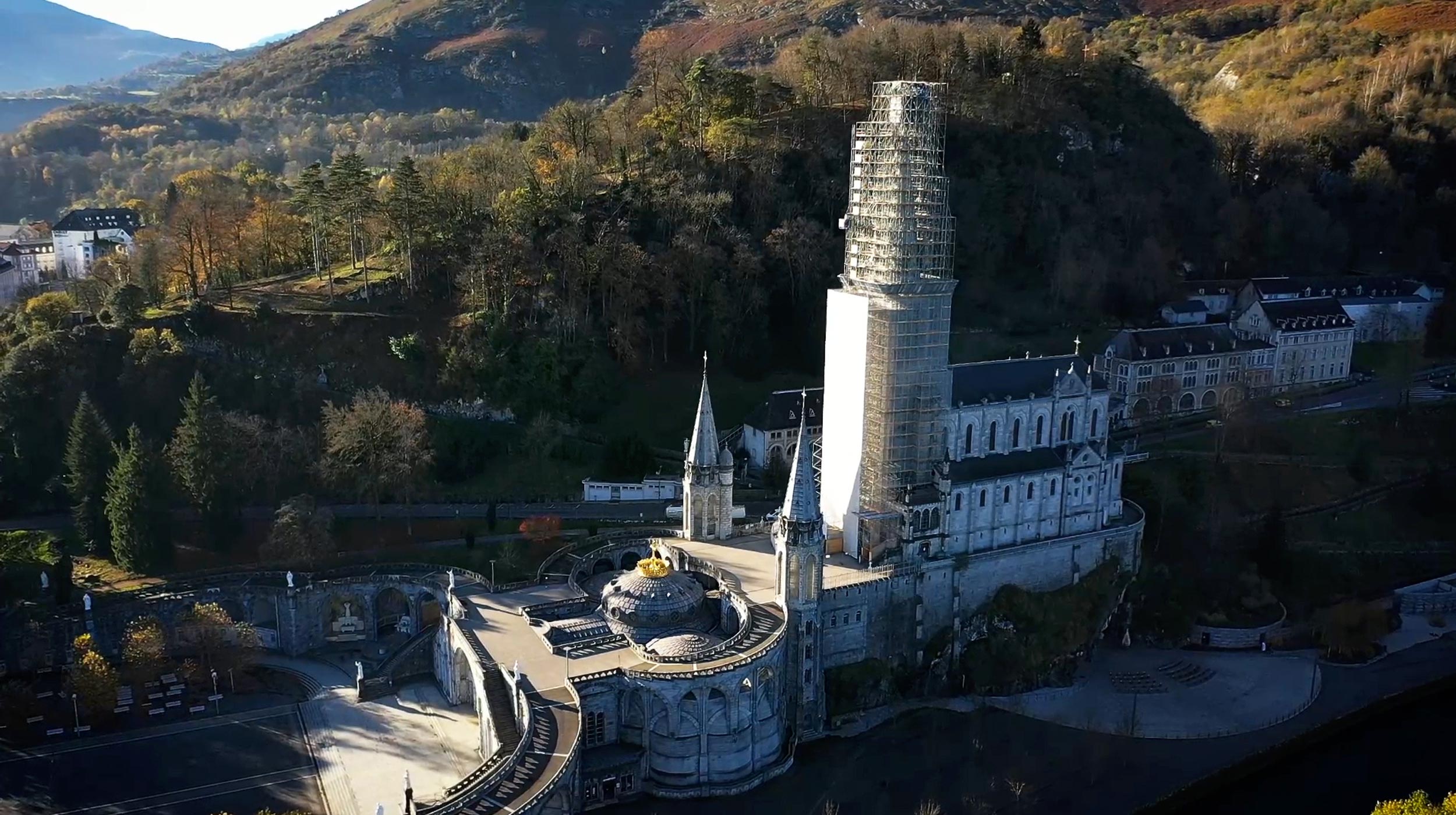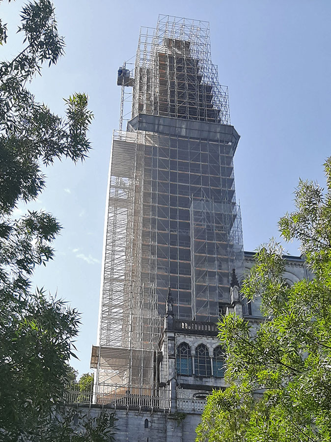 Le clocher se situe à presque 100 mètres au-dessus de la grotte. Aussi, une zone de protection provisoire a été délimitée pour assurer la protection et la sécurité des pèlerins et prévenir tout risque de chute de pierres. Pour compléter la protection du chantier, un filet d’échafaudage a été posé sur les 3 façades secondaires et un filet plus dense, sur la façade côté parvis, permettant la projection de photos ou de vidéos.